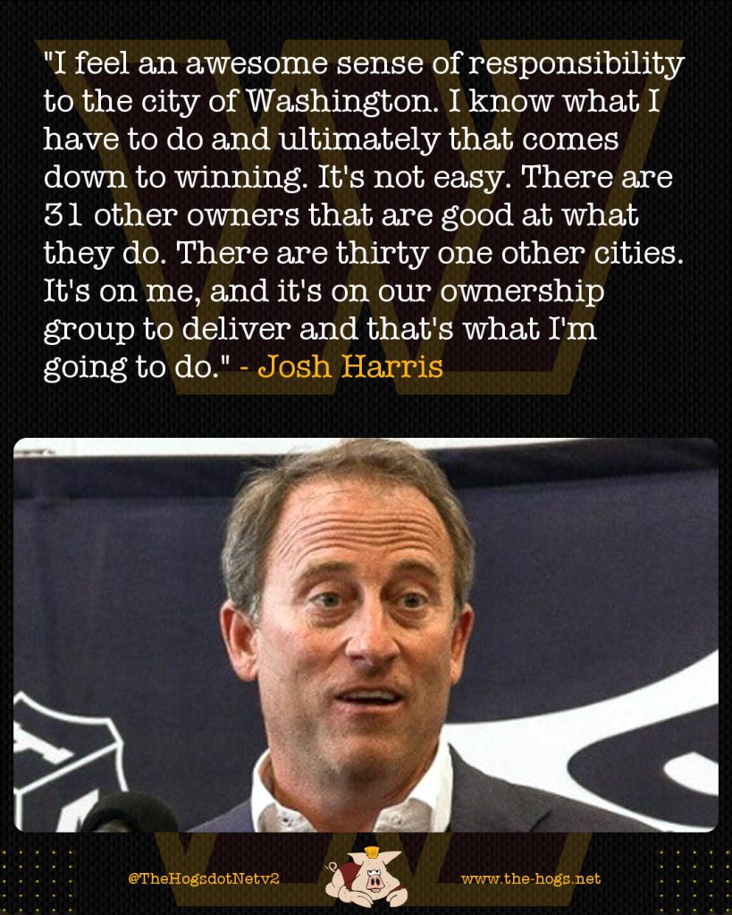 “I feel an awesome sense of responsibility to the city of Washington,” said Harris at the press conference to announce the sale. “I know what I have to do and ultimately that comes down to winning. It’s not easy. There are 31 other owners that are good at what they do. There are thirty one other cities. It’s on me, and it’s on our ownership group to deliver and that’s what I’m going to do.”